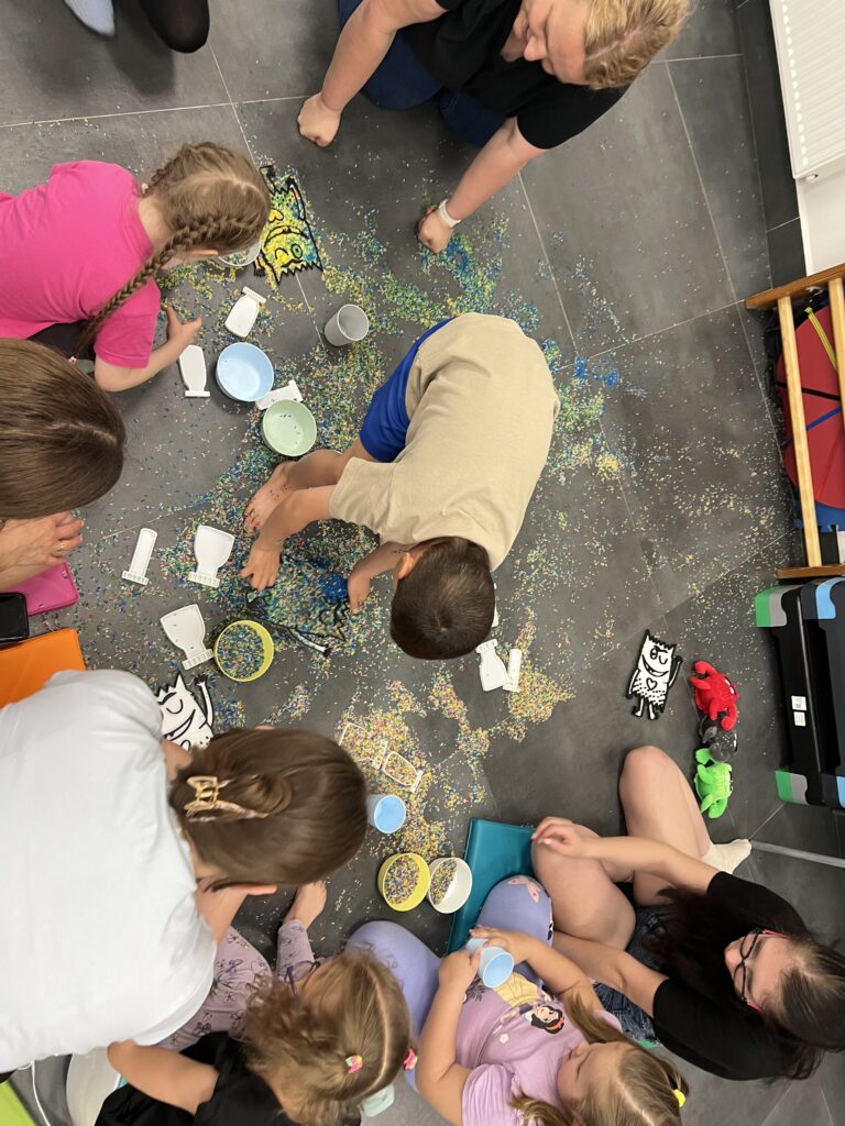 Te zajęcia były zaproszeniem do świata emocji – ale nie przez definicje i pytania wprost. Zamiast tego pojawiły się kolory, ryż przesypujący się między palcami i potwory emocji, które pomogły dzieciom oswoić to, co czasem trudne do nazwania.