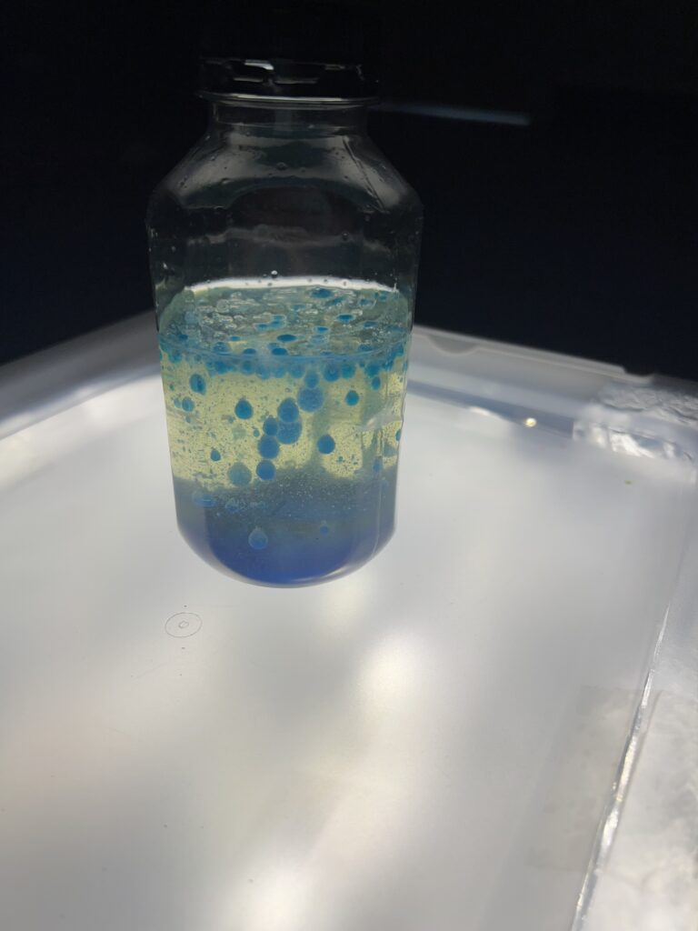 • obserwowały „emocje w butelce” – krople barwnika w wodzie, które powoli się łączyły, opadały lub mieszały,